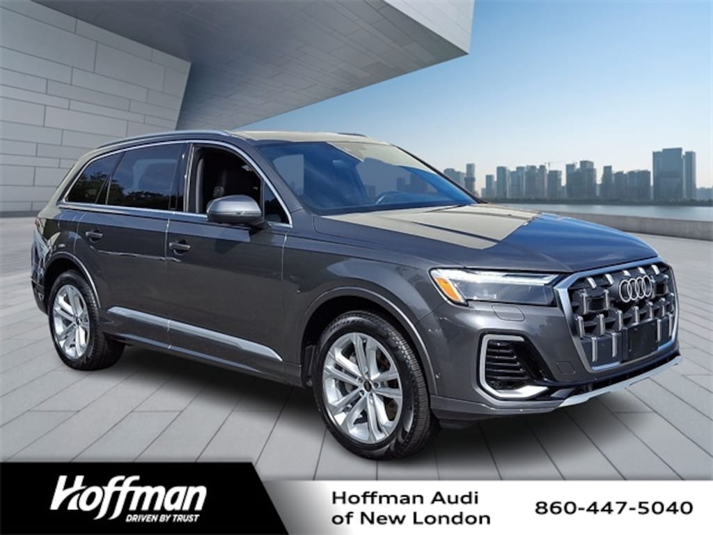 Certified. Gray Metallic 2025 Audi Q7 55 Premium Plus quattro quattro 8-Speed Automatic with Tiptronic 3.0L TFSI RECENT HOFFMAN TRADE, CLEAN CAR FAX...NO ACCIDENTS, AUDI CERTIFIED, SERVICE RECORDS AVAILABLE, ONE OWNER, SUNROOF MOONROOF, REMAINDER OF FACTORY WARRANTY, 6 MONTH OR 6,000 POWERTRAIN WARRANTY, Bang & Olufsen Premium Sound System w/3D Sound, Convenience Package, Dual-Pane Acoustic Glass for Side Windows, Executive Package (DISC), Four-Zone Automatic Climate Control, Front Seats w/Ventilation, Heated Rear Seats, Heated Steering Wheel, Illuminated Door Sills, LED Interior Lighting Package Plus, Navigation system: Audi MMI Navigation plus with Touch Response, Premium Plus Package, Rear Door/Side Windows & Tailgate Sunshades, Top View Camera System, Traffic Sign Recognition, Wheels: 20" 5-Double-Spoke, Wireless Phone Charging Pad.