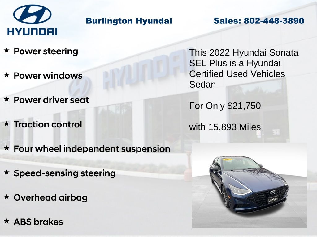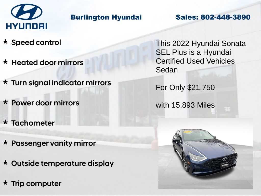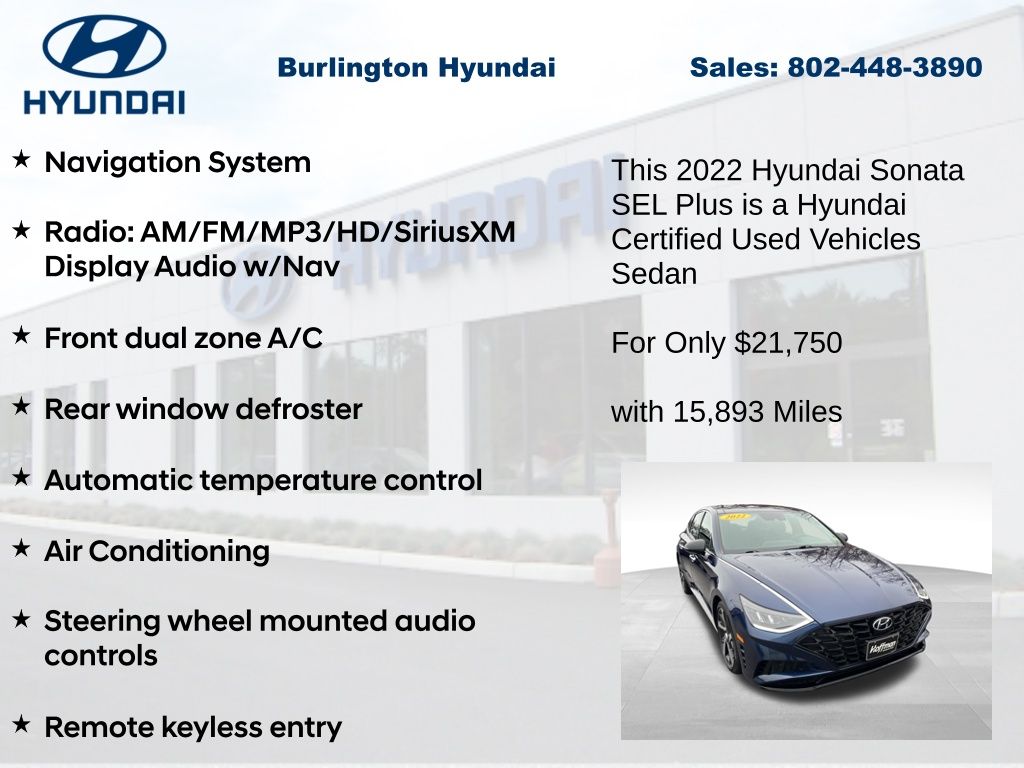 Discover the perfect blend of style, technology, and efficiency in the 2022 Hyundai Sonata SEL Plus. Experience the difference for yourself by scheduling a test drive today. We look forward to helping you find the perfect vehicle to meet your needs.