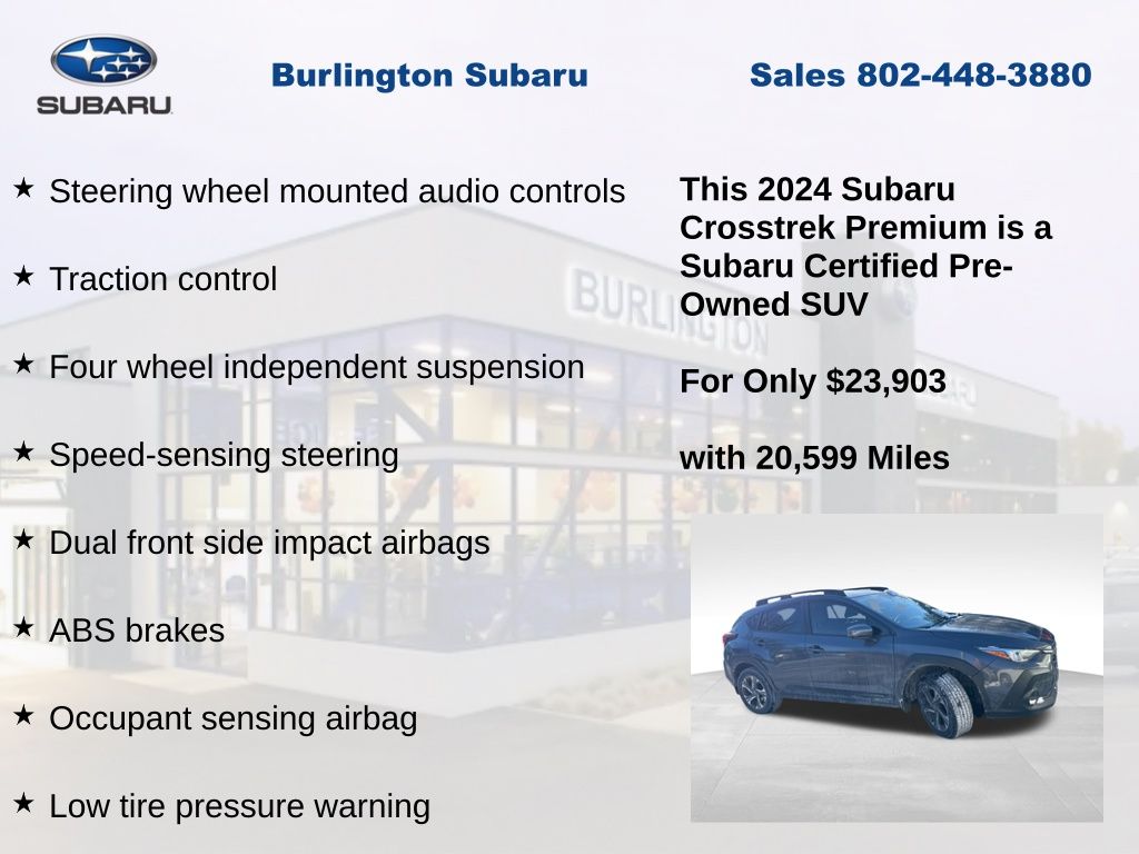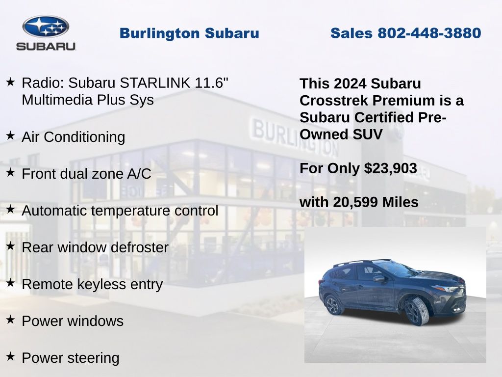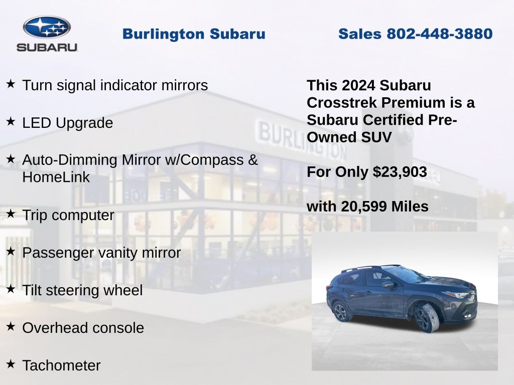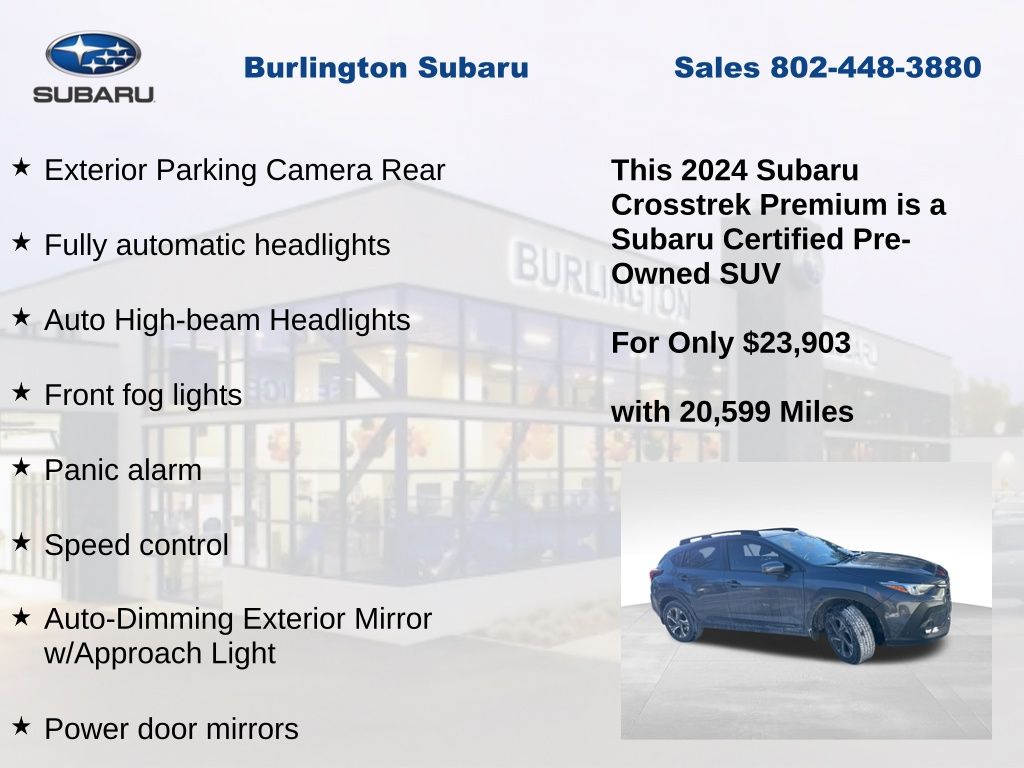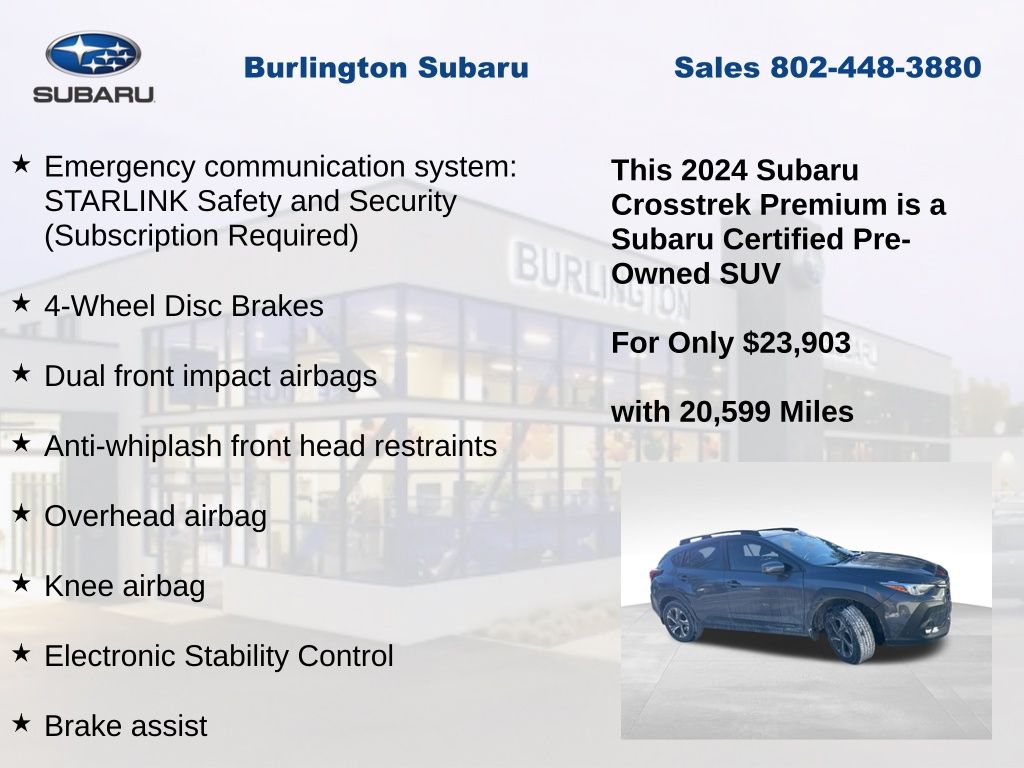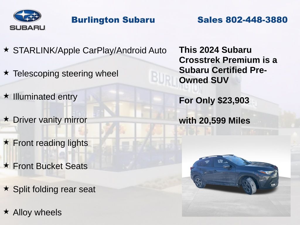 CARFAX One-Owner. Subaru Crosstrek Premium 2024 Certified. 4-Wheel Disc Brakes, ABS brakes, Air Conditioning, Alloy wheels, Anti-whiplash front head restraints, Auto High-beam Headlights, Auto-Dimming Exterior Mirror w/Approach Light, Auto-Dimming Mirror w/Compass & HomeLink, Automatic temperature control, Brake assist, Driver vanity mirror, Dual front impact airbags, Dual front side impact airbags, Electronic Stability Control, Emergency communication system: STARLINK Safety and Security (Subscription Required), Exterior Parking Camera Rear, Four wheel independent suspension, Front Bucket Seats, Front dual zone A/C, Front fog lights, Front reading lights, Fully automatic headlights, Illuminated entry, Knee airbag, LED Upgrade, Low tire pressure warning, Occupant sensing airbag, Overhead airbag, Overhead console, Panic alarm, Passenger vanity mirror, Power door mirrors, Power steering, Power windows, Radio: Subaru STARLINK 11.6" Multimedia Plus Sys, Rear window defroster, Rear window wiper, Remote keyless entry, Speed control, Speed-sensing steering, Split folding rear seat, STARLINK/Apple CarPlay/Android Auto, Steering wheel mounted audio controls, Tachometer, Telescoping steering wheel, Tilt steering wheel, Traction control, Trip computer, Turn signal indicator mirrors, Variably intermittent wipers. Odometer is 5497 miles below market average!
