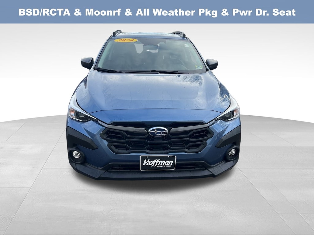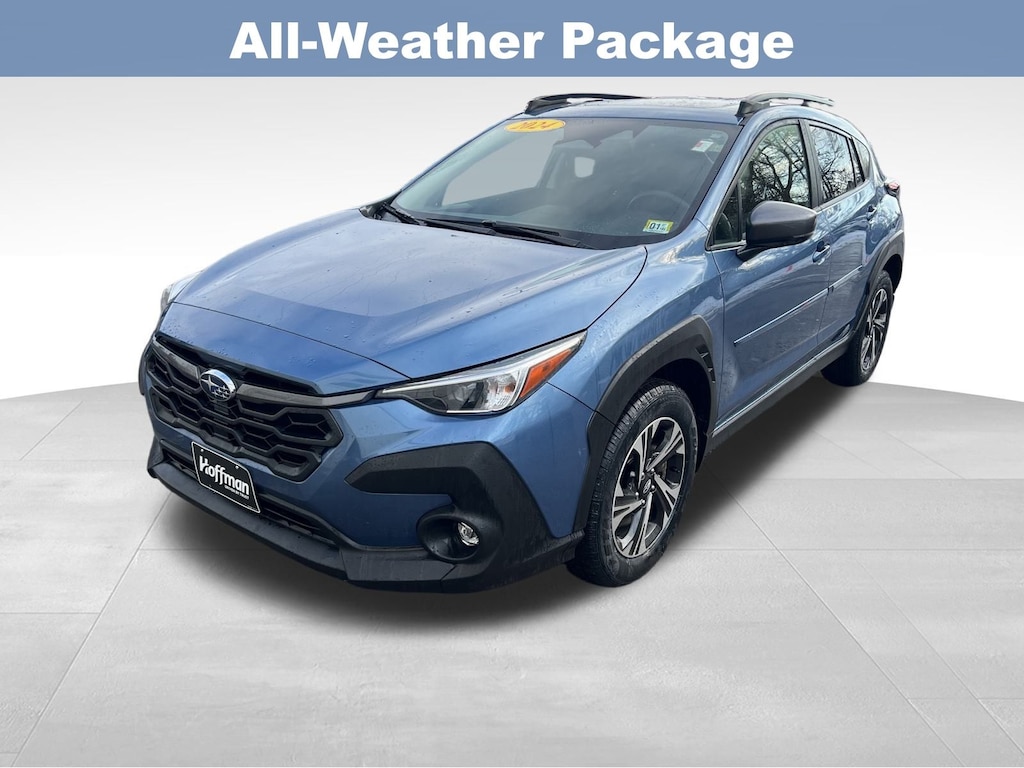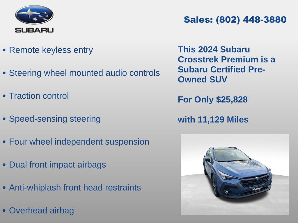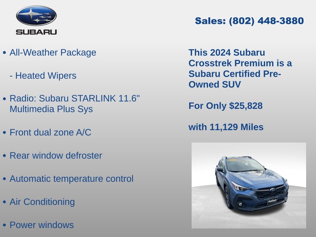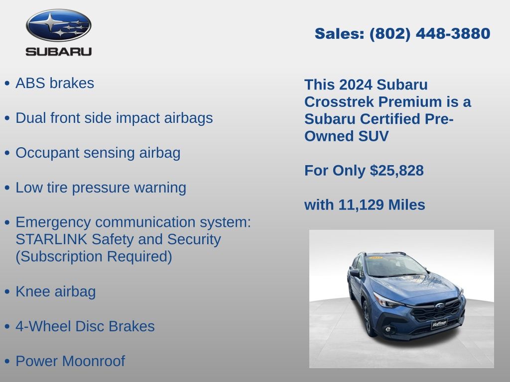 CARFAX One-Owner. Clean CARFAX. Subaru Crosstrek Premium 2024 Certified. 10-Way Power Driver's Seat, 4-Wheel Disc Brakes, ABS brakes, Air Conditioning, All-Weather Package, Alloy wheels, Anti-whiplash front head restraints, Auto High-beam Headlights, Automatic temperature control, Blind Spot Detection w/Rear Cross-Traffic Alert, Brake assist, BSD/RCTA & Moonrf & All Weather Pkg & Pwr Dr. Seat, Driver vanity mirror, Dual front impact airbags, Dual front side impact airbags, Electronic Stability Control, Emergency communication system: STARLINK Safety and Security (Subscription Required), Exterior Parking Camera Rear, Four wheel independent suspension, Front Bucket Seats, Front dual zone A/C, Front fog lights, Front reading lights, Fully automatic headlights, Heated Exterior Mirrors, Heated Front Seats, Heated Wipers, Illuminated entry, Knee airbag, Low tire pressure warning, Occupant sensing airbag, Outside temperature display, Overhead airbag, Panic alarm, Passenger vanity mirror, Power door mirrors, Power Moonroof, Power steering, Power windows, Premium Cloth Upholstery, Radio: Subaru STARLINK 11.6" Multimedia Plus Sys, Rear window defroster, Rear window wiper, Remote keyless entry, Speed control, Speed-sensing steering, Split folding rear seat, STARLINK/Apple CarPlay/Android Auto, Steering wheel mounted audio controls, Tachometer, Telescoping steering wheel, Tilt steering wheel, Traction control, Trip computer, Turn signal indicator mirrors, Variably intermittent wipers. Odometer is 14444 miles below market average!
