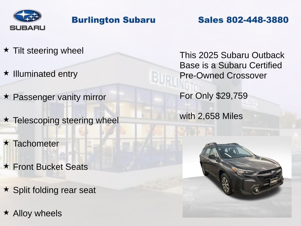 CARFAX One-Owner. Clean CARFAX. Subaru Outback 2.5i 2025 Certified. 4-Wheel Disc Brakes, ABS brakes, Air Conditioning, Alloy wheels, Apple CarPlay & Android Auto, Auto High-beam Headlights, Automatic temperature control, Brake assist, Driver vanity mirror, Dual front impact airbags, Dual front side impact airbags, Electronic Stability Control, Exterior Parking Camera Rear, Four wheel independent suspension, Front Bucket Seats, Front fog lights, Front reading lights, Fully automatic headlights, Illuminated entry, Knee airbag, Low tire pressure warning, Occupant sensing airbag, Outside temperature display, Overhead airbag, Passenger vanity mirror, Power door mirrors, Power steering, Power windows, Radio: Subaru Dual 7.0" Multimedia System, Rear window defroster, Rear window wiper, Remote keyless entry, Speed control, Speed-sensing steering, Split folding rear seat, Steering wheel mounted audio controls, Tachometer, Telescoping steering wheel, Tilt steering wheel, Traction control, Trip computer. Odometer is 736 miles below market average!