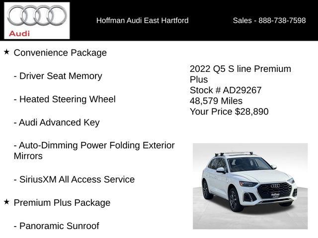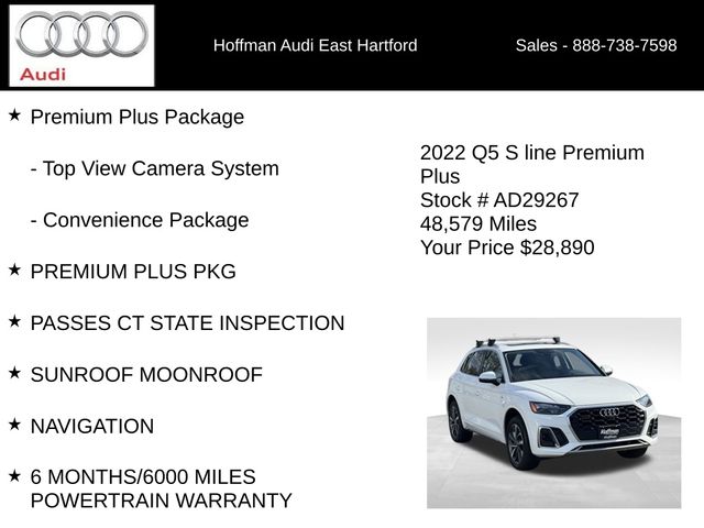 PREMIUM PLUS PKG, PASSES CT STATE INSPECTION, SUNROOF MOONROOF, NAVIGATION, 6 MONTHS/6000 MILES POWERTRAIN WARRANTY, 10 Speakers, 4-Wheel Disc Brakes, 5.302 Axle Ratio, ABS brakes, Adaptive Cruise Control w/Traffic Jam Assist, Air Conditioning, Alloy wheels, AM/FM radio, Audi Active Lane Assist, Audi Advanced Key, Audi Phone Box, Audi Virtual Cockpit Plus, Auto High-beam Headlights, Auto-Dimming Power Folding Exterior Mirrors, Auto-dimming Rear-View mirror, Automatic temperature control, Brake assist, Bumpers: body-color, Compass, Convenience Package, Delay-off headlights, Driver door bin, Driver Seat Memory, Driver vanity mirror, Dual front impact airbags, Dual front side impact airbags, Electronic Stability Control, Emergency communication system: Audi connect CARE, Exterior Parking Camera Rear, Four wheel independent suspension, Front anti-roll bar, Front Bucket Seats, Front Center Armrest, Front dual zone A/C, Front fog lights, Front reading lights, Garage door transmitter: HomeLink, Genuine wood console insert, Genuine wood dashboard insert, Genuine wood door panel insert, Hands-On Detection Steering Wheel, Heated 8-Way Power Front Bucket Seats, Heated door mirrors, Heated front seats, Heated Steering Wheel, Illuminated entry, Leather Seating Surfaces, Leather Shift Knob, Leatherette Covered Center Console & Door Armrests, Low tire pressure warning, Occupant sensing airbag, Outside temperature display, Overhead airbag, Overhead console, Panic alarm, Panoramic Sunroof, Passenger door bin, Passenger vanity mirror, Power Adjustable Steering Column, Power door mirrors, Power driver seat, Power Liftgate, Power passenger seat, Power steering, Power windows, Premium Plus Package, Radio data system, Radio: Audi Sound System, Rain sensing wipers, Rear air conditioning, Rear anti-roll bar, Rear fog lights, Rear reading lights, Rear seat center armrest, Rear window defroster, Rear window wiper, Remote keyless entry, Roof rack, Security system, SiriusXM All Access Service, Speed control, Speed-sensing steering, Speed-Sensitive Wipers, Split folding rear seat, Spoiler, Steering wheel mounted audio controls, Tachometer, Telescoping steering wheel, Tilt steering wheel, Top View Camera System, Traction control, Trip computer, Turn signal indicator mirrors, Variably intermittent wipers, Wheels: 18" 5-Arm-Star Design, Wheels: 19" 5-Double-Arm Design Bi-Color Finish. CARFAX One-Owner. Glacier White Metallic 2022 Audi Q5 45 S line Premium quattro quattro 7-Speed Automatic S tronic 2.0L Turbocharged