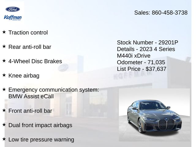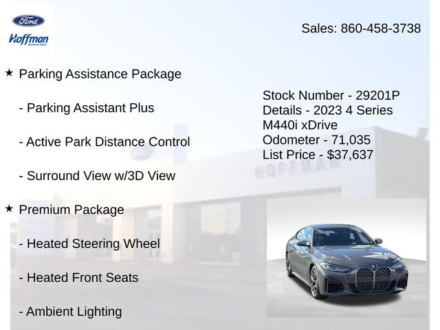 *One Owner*, 4 Series M440i xDrive, Individual Dravit Gray Metallic, 10 Speakers, 4-Wheel Disc Brakes, ABS brakes, Active Park Distance Control, Air Conditioning, AM/FM radio: SiriusXM, Ambient Lighting, Apple CarPlay & Android Auto Compatibility, Apple CarPlay Compatibility, Auto High-beam Headlights, Auto-dimming door mirrors, Auto-dimming Rear-View mirror, Automatic temperature control, BMW Assist eCall, BMW TeleServices, Brake assist, Bumpers: body-color, Compass, ConnectedDrive Services, Delay-off headlights, Driver door bin, Driver Lumbar Support, Driver vanity mirror, Dual front impact airbags, Dual front side impact airbags, Electronic Stability Control, Emergency communication system: BMW Assist eCall, Exterior Parking Camera Rear, Four wheel independent suspension, Front anti-roll bar, Front Bucket Seats, Front Center Armrest, Front dual zone A/C, Front reading lights, Fully automatic headlights, Garage door transmitter, harman/kardon Surround Sound System, Head-Up Display, Heated door mirrors, Heated Front Seats, Heated Steering Wheel, Hi-Fi Sound System, High Gloss Fine Wood Ash Grey-Brown Trim, Illuminated entry, Knee airbag, Leather Shift Knob, Low tire pressure warning, Memory seat, Navigation System, Occupant sensing airbag, Outside temperature display, Overhead airbag, Overhead console, Panic alarm, Parking Assistance Package, Parking Assistant Plus, Passenger door bin, Passenger vanity mirror, Perforated Sensatec Upholstery, Power door mirrors, Power driver seat, Power Front Seats, Power Liftgate, Power moonroof, Power passenger seat, Power steering, Power windows, Premium Package, Radio data system, Radio: AM/FM Audio System, Rain sensing wipers, Rear air conditioning, Rear anti-roll bar, Rear reading lights, Rear seat center armrest, Rear window defroster, Remote keyless entry, Security system, SiriusXM Satellite Radio, Speed-sensing steering, Speed-Sensitive Wipers, Split folding rear seat, Spoiler, Sport Seats, Sport steering wheel, Steering wheel mounted audio controls, Surround View w/3D View, Tachometer, Telescoping steering wheel, Tilt steering wheel, Traction control, Trip computer, Turn signal indicator mirrors, Variably intermittent wipers, Wheels: 18" x 8.5" M Bi-Color (Style 858M), Wireless Charging.
