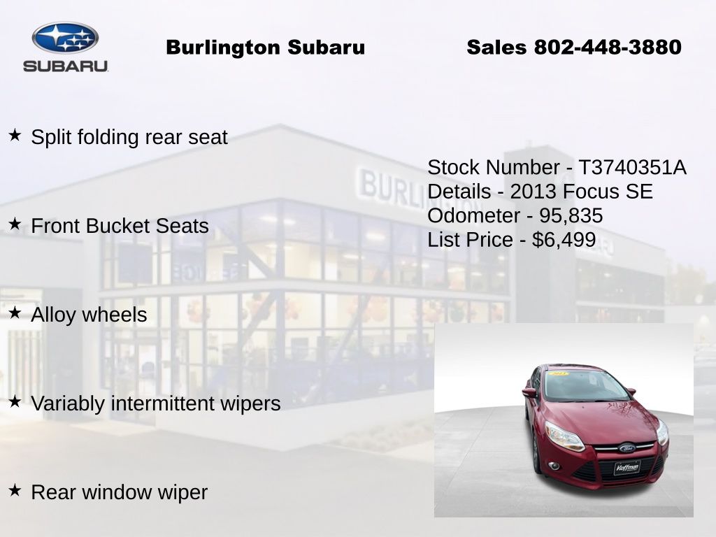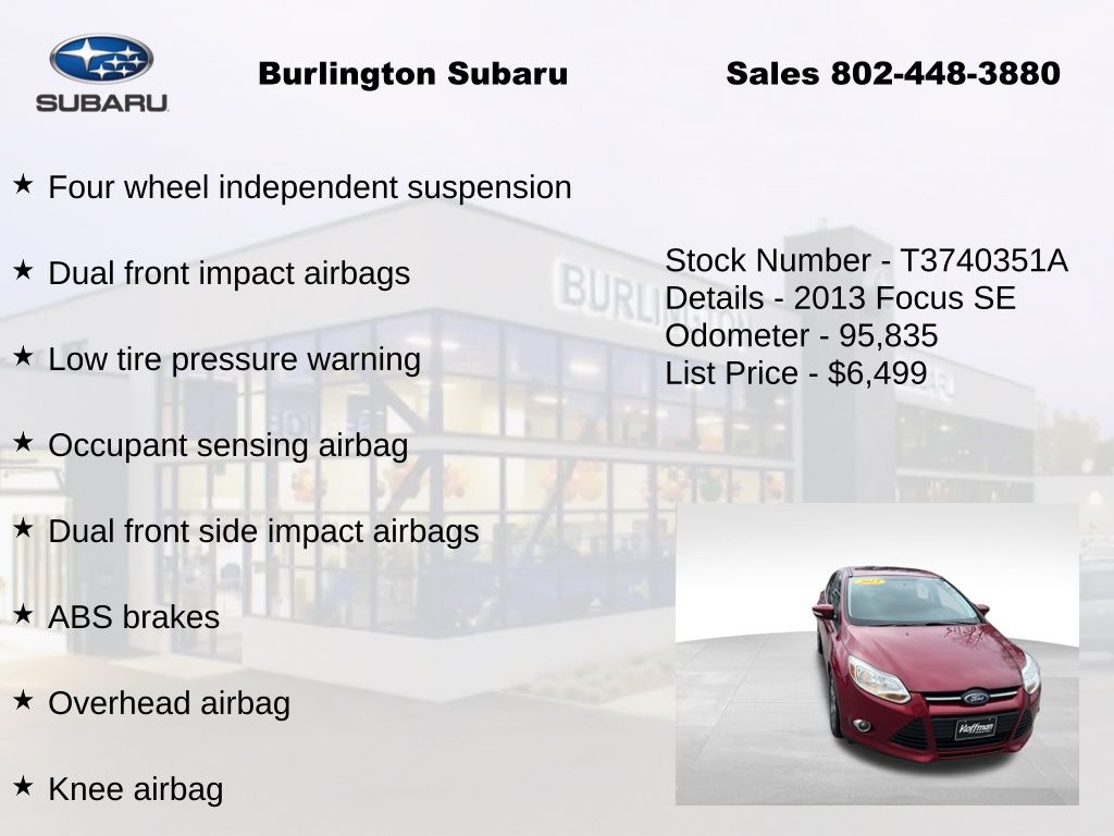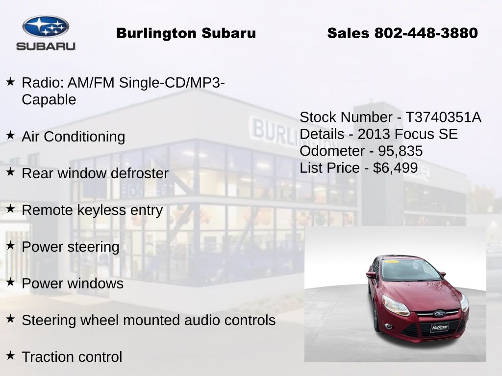 Ford Focus SE 2013 ABS brakes, Air Conditioning, Alloy wheels, Brake assist, Compass, Delay-off headlights, Driver vanity mirror, Dual front impact airbags, Dual front side impact airbags, Electronic Stability Control, Four wheel independent suspension, Front Bucket Seats, Fully automatic headlights, Illuminated entry, Knee airbag, Low tire pressure warning, Occupant sensing airbag, Outside temperature display, Overhead airbag, Panic alarm, Passenger vanity mirror, Power door mirrors, Power steering, Power windows, Radio: AM/FM Single-CD/MP3-Capable, Rear window defroster, Rear window wiper, Remote keyless entry, Speed control, Split folding rear seat, Steering wheel mounted audio controls, Tachometer, Telescoping steering wheel, Tilt steering wheel, Traction control, Trip computer, Variably intermittent wipers.