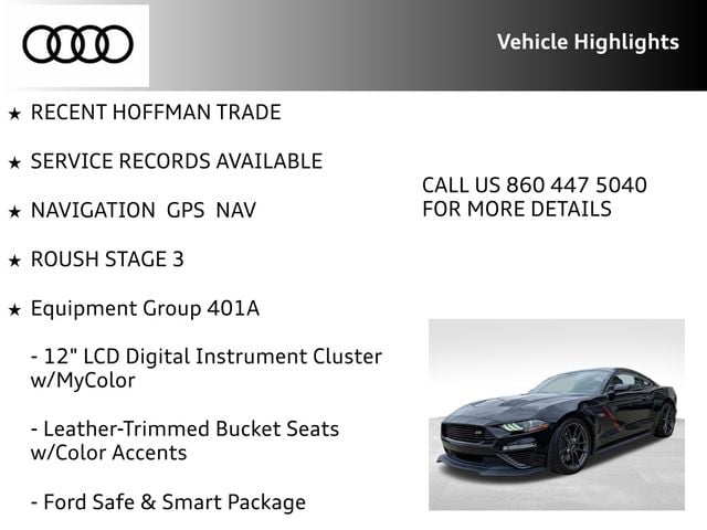 Shadow Black 2021 Ford Mustang GT Premium Roush Stage 3 Supercharged RWD 10-Speed Automatic 5.0L V8 Ti-VCT RECENT HOFFMAN TRADE, SERVICE RECORDS AVAILABLE, NAVIGATION GPS NAV, ROUSH STAGE 3, 12" LCD Digital Instrument Cluster w/MyColor, ABS brakes, Adaptive Cruise Control, Alloy wheels, Compass, Electronic Stability Control, Engine Spun Aluminum Instrument Panel, Equipment Group 401A, Ford Safe & Smart Package, Gauge Pack (Oil Pressure & Vacuum), GT Performance Package, HD Radio, Heated Steering Wheel, Heavy-Duty Front Springs, Illuminated entry, Integrated Turn Signals, Larger Brake Rotors, Larger Radiator, Leather-Trimmed Bucket Seats w/Color Accents, Low tire pressure warning, MagneRide Damping System, Memory Driver Seat, Mirrors & Ambient Lighting, Radio: B&O Sound System by Bang & Olufsen, Remote keyless entry, Traction control, Unique Stability Control, Voice-Activated Touch-Screen Navigation System, Wheels: 19" x 9" Fr & 19" x 9.5" Rr Ebony Black.
