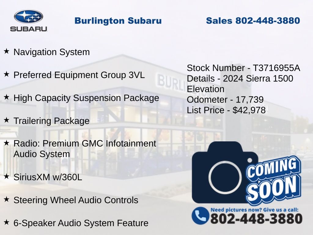 CARFAX One-Owner. Clean CARFAX. GMC Sierra 1500 Elevation 2024 10-Way Power Driver Seat Adjuster w/Lumbar, 120-Volt Bed Mounted Power Outlet, 120-Volt Interior Power Outlet, 2 Charge/Data USB Ports, 2 Type-C Charge-Only Rear USB Ports, 220 Amp Alternator, 4-Way Manual Passenger Seat Adjuster, 4-Wheel Disc Brakes, 6-Speaker Audio System Feature, ABS brakes, Air Conditioning, Alloy wheels, AM/FM radio: SiriusXM with 360L, Apple CarPlay/Android Auto, Auto High-beam Headlights, Auto-Locking Rear Differential, Automatic Emergency Braking, Automatic temperature control, Body Color Header w/Gloss Black Mesh Grille Bars, Brake assist, Color-Keyed Carpeting Floor Covering, Compass, Deep-Tinted Glass, Delay-off headlights, Driver vanity mirror, Dual front impact airbags, Dual front side impact airbags, Electric Rear-Window Defogger, Electronic Stability Control, Following Distance Indicator, Forward Collision Alert, Front dual zone A/C, Front fog lights, Front Frame-Mounted Black Recovery Hooks, Front Pedestrian Braking, Front reading lights, Front Rubberized-Vinyl Floor Mats, Front wheel independent suspension, Fully automatic headlights, GMC Connected Access Capable, HD Rear Vision Camera, Heated door mirrors, Heated Driver & Front Outboard Passenger Seating, Heated steering wheel, High Capacity Suspension Package, Hitch Guidance, Illuminated entry, IntelliBeam Automatic High Beam On/Off, Keyless Open & Start, Lane Keep Assist w/Lane Departure Warning, LED Cargo Area Lighting, Low tire pressure warning, Manual Tilt-Wheel & Telescoping Steering Column, Navigation System, Occupant sensing airbag, OnStar & GMC Connected Services Capable, Outside temperature display, Overhead airbag, Overhead console, Panic alarm, Passenger vanity mirror, Power Door Locks, Power door mirrors, Power driver seat, Power Front Windows w/Driver Express Up/Down, Power Front Windows w/Passenger Express Down, Power Rear Windows w/Express Down, Power steering, Power windows, Preferred Equipment Group 3VL, Push Button Start, Radio: Premium GMC Infotainment Audio System, Rear reading lights, Rear Rubberized-Vinyl Floor Mats, Rear seat center armrest, Rear step bumper, Rear window defroster, Remote keyless entry, Remote Vehicle Starter System, SiriusXM w/360L, Speed control, Speed-sensing steering, Split folding rear seat, Steering Wheel Audio Controls, Steering wheel mounted audio controls, Tachometer, Telescoping steering wheel, Theft Deterrent System (Unauthorized Entry), Tilt steering wheel, Traction control, Trailering Package, Trip computer, Variably intermittent wipers, Voltmeter, Wi-Fi Hotspot Capable, Wireless Apple CarPlay/Wireless Android Auto. Odometer is 4589 miles below market average!