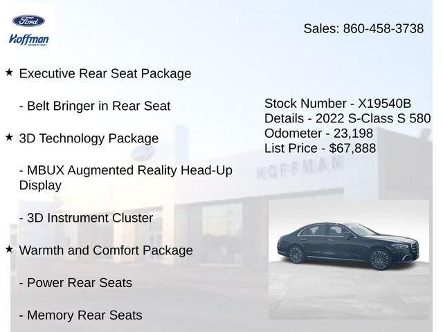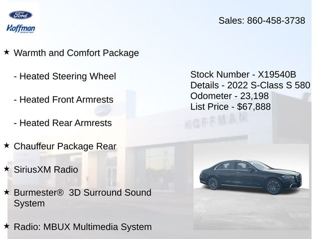 S-Class S 580 4MATIC®, 4.0L V8, Black, 15 Speakers, 3D Instrument Cluster, 3D Technology Package, 4-Wheel Disc Brakes, 4-Zone Climate Control, ABS brakes, Active Multicontour Rear Seats, Adaptive Rear Lighting, Adaptive suspension, Air Conditioning, AM/FM radio: SiriusXM, Apple CarPlay®/Android Auto®, Auto High-beam Headlights, Auto tilt-away steering wheel, Auto-dimming door mirrors, Auto-dimming Rear-View mirror, Auto-leveling suspension, Automatic temperature control, Belt Bringer in Rear Seat, Brake assist, Bumpers: body-color, Burmester® 3D Surround Sound System, Calf Massage Function, Chauffeur Package Rear, Child-Seat-Sensing Airbag, Compass, Delay-off headlights, Door auto-latch, Driver door bin, Driver vanity mirror, Dual front impact airbags, Dual front side impact airbags, Easy Adjust Headrests, Electric Adjust Rear Seat, Electronic Stability Control, Emergency communication system: eCall Emergency System, Executive Rear Seat, Executive Rear Seat Package, Exterior Parking Camera Rear, Four wheel independent suspension, Front anti-roll bar, Front Bucket Seats, Front Center Armrest, Front dual zone A/C, Front reading lights, Garage door transmitter: HomeLink, Genuine wood dashboard insert, Genuine wood door panel insert, Head restraints memory, Heated Front Armrests, Heated front seats, Heated Rear Armrests, Heated Steering Wheel, HVAC memory, Illuminated entry, Knee airbag, Leather steering wheel, Low tire pressure warning, MBUX Augmented Reality Head-Up Display, MBUX Rear Tablet, MBUX w/Navigation, Memory Rear Seats, Memory seat, Nappa Leather Upholstery, Occupant sensing airbag, Outside temperature display, Overhead airbag, Overhead console, Panic alarm, Passenger vanity mirror, Power adjustable front head restraints, Power adjustable rear head restraints, Power door mirrors, Power driver seat, Power moonroof: Panorama, Power passenger seat, Power Rear Seats, Power steering, Power windows, Powered Rapid-Heated & Ventilated Front Seats, Premium audio system: MBUX, Radio data system, Radio: MBUX Multimedia System, Rain sensing wipers, Rear Airbag, Rear anti-roll bar, Rear Beltbag, Rear Design Belt Buckles, Rear fog lights, Rear Neck Heating, Rear reading lights, Rear seat center armrest, Rear Seat Package, Rear side impact airbag, Rear Window Blind, Rear window defroster, Remote keyless entry, Security system, SiriusXM Radio, Speed control, Speed-sensing steering, Speed-Sensitive Wipers, Steering wheel memory, Steering wheel mounted audio controls, Tachometer, Telescoping steering wheel, Tilt steering wheel, Traction control, Trip computer, Turn signal indicator mirrors, Variably intermittent wipers, Ventilated front seats, Ventilated Rear Seats, Warmth and Comfort Package, Wheels: 19" x 8.5J Aero 10-Twin Multispoke, Wireless Charging Rear, Wireless Smartphone Integration.