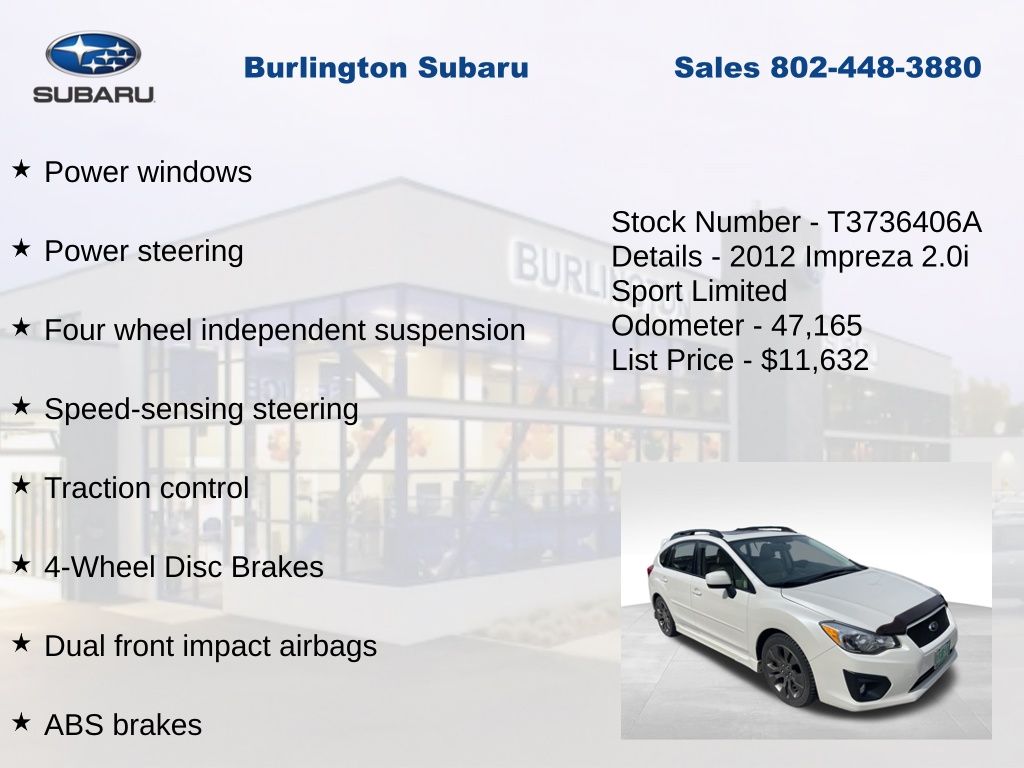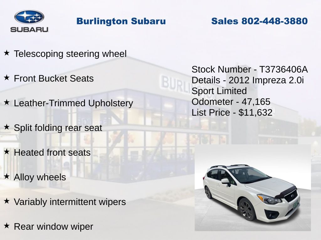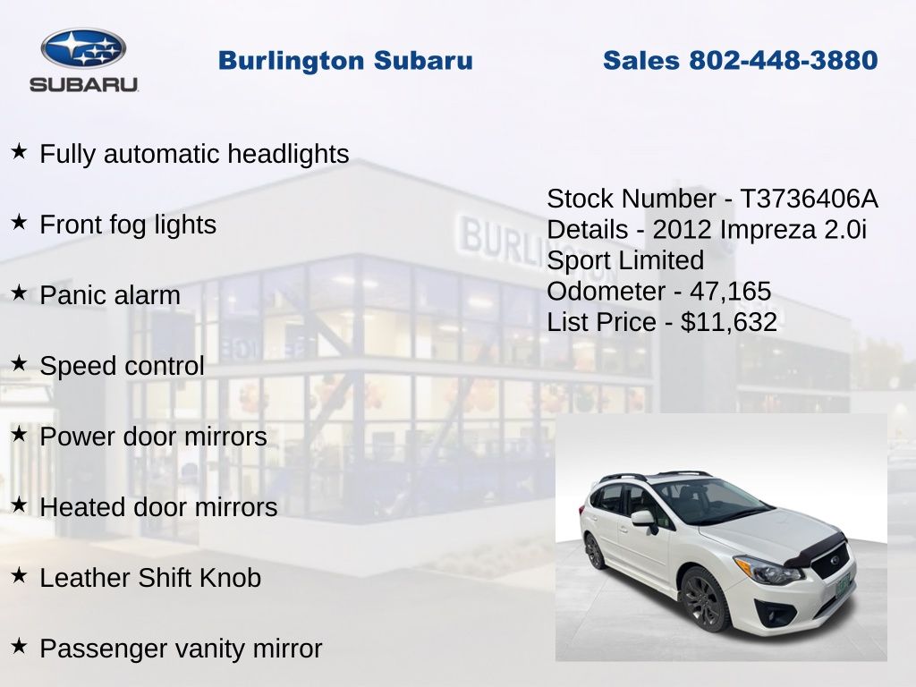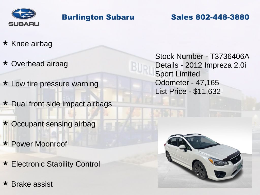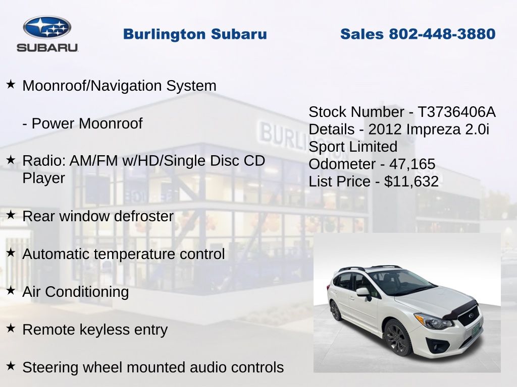 CARFAX One-Owner. Clean CARFAX. Subaru Impreza 2.0i Sport Limited 2012 4-Wheel Disc Brakes, ABS brakes, Air Conditioning, Alloy wheels, Automatic temperature control, Brake assist, Driver vanity mirror, Dual front impact airbags, Dual front side impact airbags, Electronic Stability Control, Four wheel independent suspension, Front Bucket Seats, Front fog lights, Front reading lights, Fully automatic headlights, Heated door mirrors, Heated front seats, Illuminated entry, Knee airbag, Leather Shift Knob, Leather steering wheel, Leather-Trimmed Upholstery, Low tire pressure warning, Moonroof/Navigation System, Occupant sensing airbag, Outside temperature display, Overhead airbag, Panic alarm, Passenger vanity mirror, Power door mirrors, Power Moonroof, Power steering, Power windows, Radio: AM/FM w/HD/Single Disc CD Player, Rear window defroster, Rear window wiper, Remote keyless entry, Speed control, Speed-sensing steering, Split folding rear seat, Steering wheel mounted audio controls, Tachometer, Telescoping steering wheel, Tilt steering wheel, Traction control, Trip computer, Variably intermittent wipers. Odometer is 73509 miles below market average!