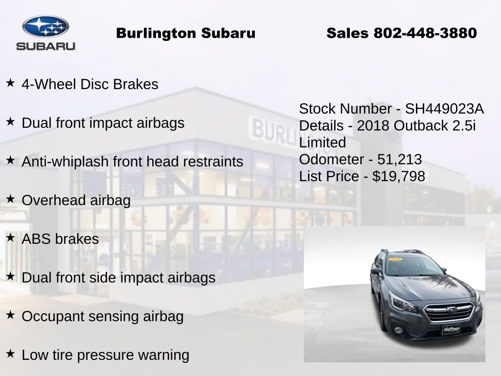 CARFAX One-Owner. Clean CARFAX. Subaru Outback 2.5i 2018 4-Wheel Disc Brakes, ABS brakes, Air Conditioning, Alloy wheels, Anti-whiplash front head restraints, Apple CarPlay/Android Auto, Auto-dimming Rear-View mirror, Automatic temperature control, Brake assist, CD player, Compass, Driver vanity mirror, Dual front impact airbags, Dual front side impact airbags, Electronic Stability Control, Emergency communication system: STARLINK, Exterior Parking Camera Rear, Four wheel independent suspension, Front dual zone A/C, Front fog lights, Front reading lights, Fully automatic headlights, Garage door transmitter, harman/kardon® Speakers, Heated door mirrors, Heated Reclining Front Bucket Seats, Illuminated entry, Leather Shift Knob, Low tire pressure warning, Memory seat, Occupant sensing airbag, Outside temperature display, Overhead airbag, Panic alarm, Passenger vanity mirror, Perforated Leather-Trimmed Upholstery, Power door mirrors, Power driver seat, Power Liftgate, Power moonroof, Power passenger seat, Power steering, Power windows, Rear window defroster, Rear window wiper, Remote keyless entry, Smartphone Integration, Speed control, Speed-sensing steering, Split folding rear seat, Steering wheel mounted audio controls, Steering Wheel Paddle Shift Control Switches, Tachometer, Telescoping steering wheel, Tilt steering wheel, Traction control, Trip computer, Turn signal indicator mirrors, Variably intermittent wipers, Vehicle Information Display. Odometer is 41009 miles below market average!