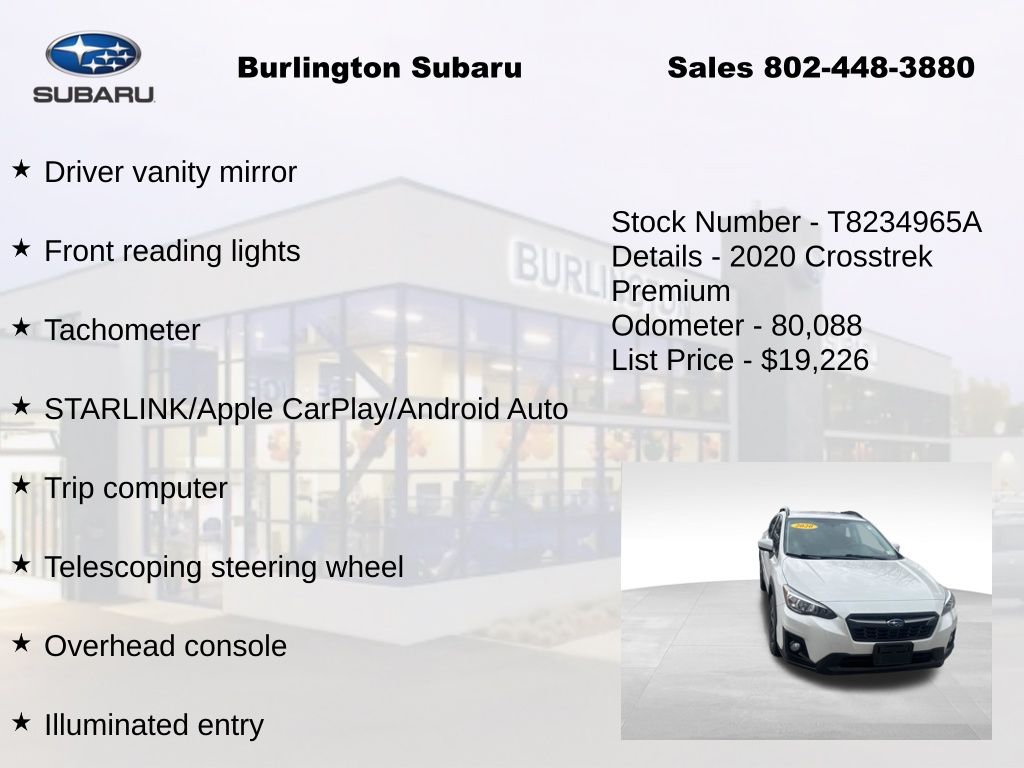 CARFAX One-Owner. Clean CARFAX. Subaru Crosstrek Premium 2020 4-Wheel Disc Brakes, ABS brakes, Air Conditioning, Alloy wheels, AM/FM radio: SiriusXM, Automatic temperature control, Brake assist, CD player, Driver vanity mirror, Dual front impact airbags, Dual front side impact airbags, Electronic Stability Control, Emergency communication system: STARLINK Safety and Security (Subscription Required), Exterior Parking Camera Rear, Four wheel independent suspension, Front fog lights, Front reading lights, Fully automatic headlights, Heated door mirrors, Heated Front Bucket Seats, Illuminated entry, Knee airbag, Low tire pressure warning, Occupant sensing airbag, Outside temperature display, Overhead airbag, Overhead console, Panic alarm, Passenger vanity mirror, Power door mirrors, Power steering, Power windows, Rear window defroster, Rear window wiper, Remote keyless entry, Speed control, Speed-sensing steering, Split folding rear seat, STARLINK/Apple CarPlay/Android Auto, Steering wheel mounted audio controls, Subaru Starlink Smartphone Integration, Tachometer, Telescoping steering wheel, Tilt steering wheel, Traction control, Trip computer, Variably intermittent wipers.