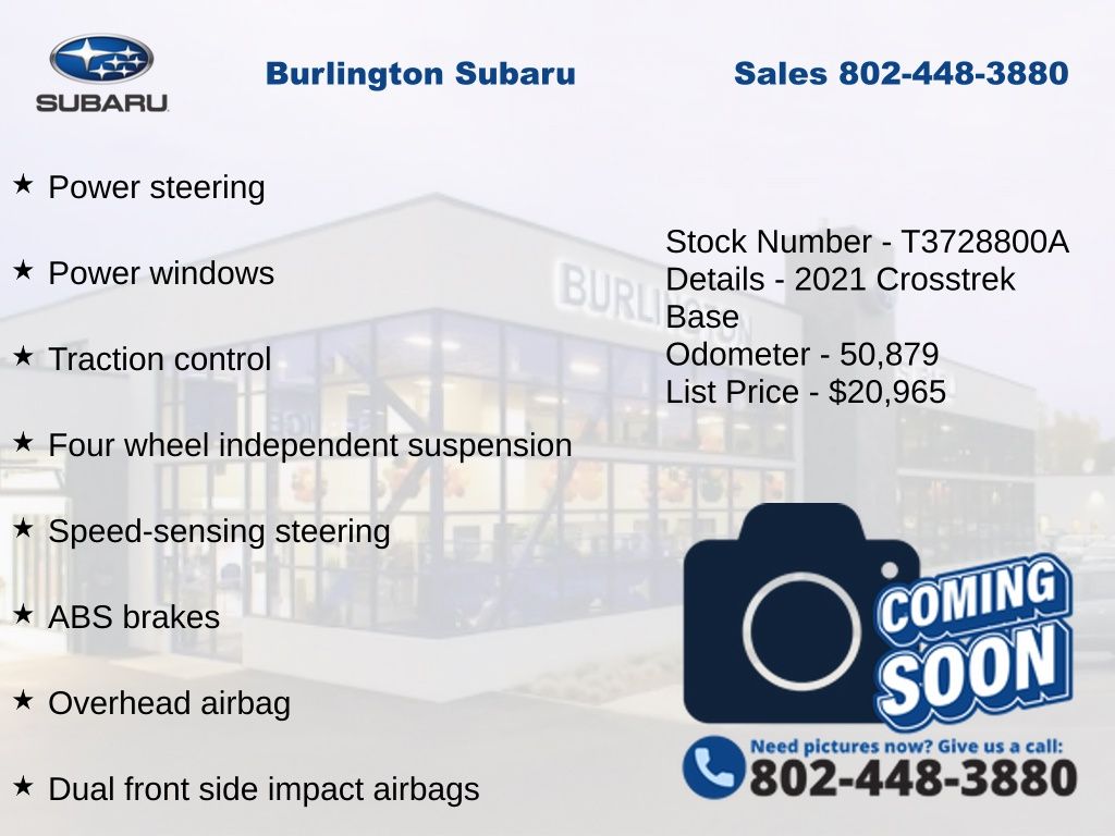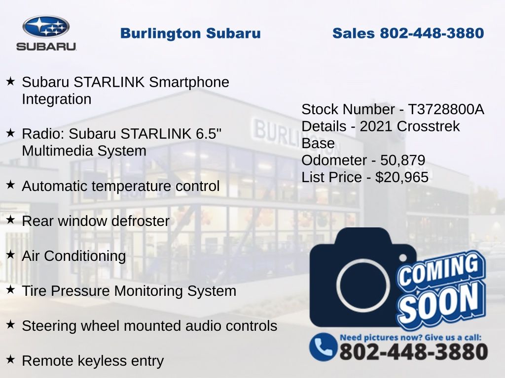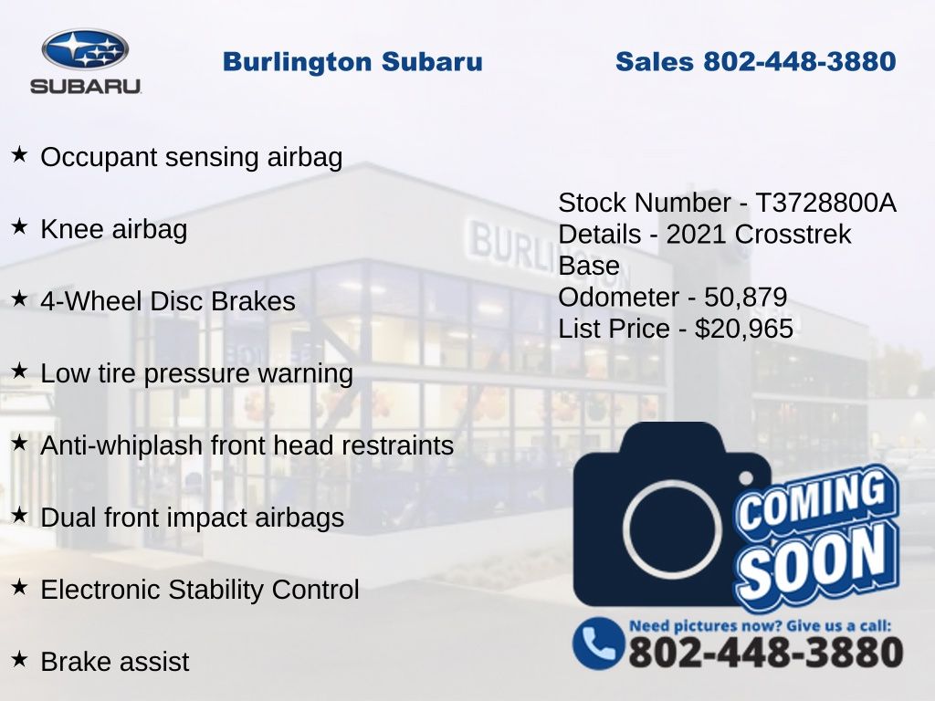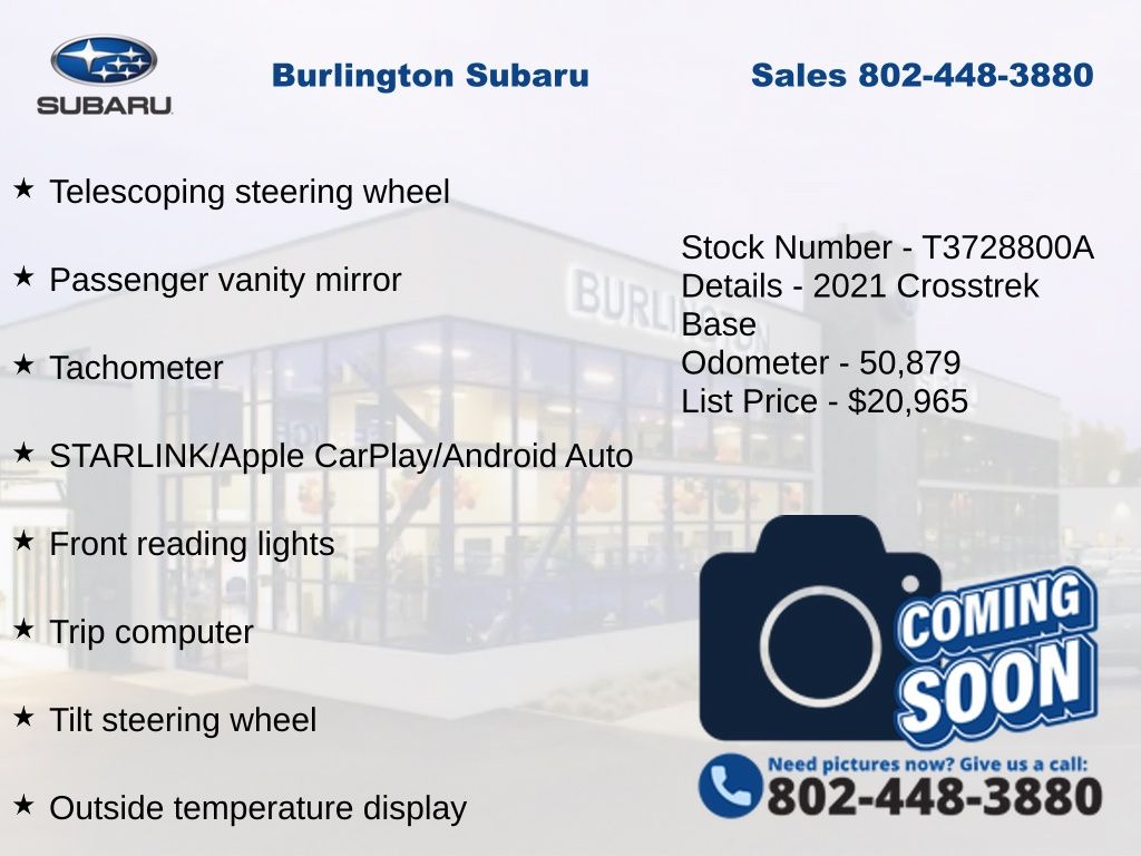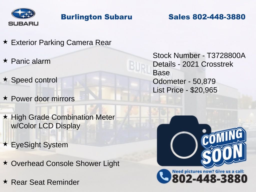 CARFAX One-Owner. Clean CARFAX. Subaru Crosstrek 2021 4-Wheel Disc Brakes, ABS brakes, Air Conditioning, Alloy wheels, Anti-whiplash front head restraints, Automatic temperature control, Brake assist, Driver vanity mirror, Dual front impact airbags, Dual front side impact airbags, Electronic Stability Control, Exterior Parking Camera Rear, EyeSight System, Four wheel independent suspension, Front Bucket Seats, Front reading lights, High Grade Combination Meter w/Color LCD Display, Illuminated entry, Knee airbag, Low tire pressure warning, Occupant sensing airbag, Outside temperature display, Overhead airbag, Overhead Console Shower Light, Panic alarm, Passenger vanity mirror, Power door mirrors, Power steering, Power windows, Radio: Subaru STARLINK 6.5" Multimedia System, Rear Seat Reminder, Rear window defroster, Rear window wiper, Remote keyless entry, Speed control, Speed-sensing steering, Split folding rear seat, STARLINK/Apple CarPlay/Android Auto, Steering wheel mounted audio controls, Subaru STARLINK Smartphone Integration, Tachometer, Telescoping steering wheel, Tilt steering wheel, Tire Pressure Monitoring System, Traction control, Trip computer, Variably intermittent wipers. Odometer is 20339 miles below market average!