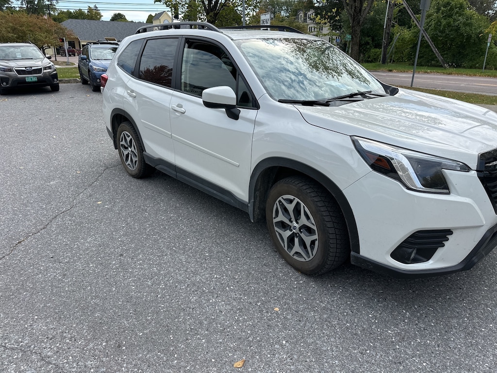 CARFAX One-Owner. Subaru Forester Premium 2023 4-Wheel Disc Brakes, ABS brakes, Air Conditioning, Alloy wheels, AM/FM radio: SiriusXM, Anti-whiplash front head restraints, Auto High-beam Headlights, Automatic temperature control, Blind-Spot Detection (BSD), Brake assist, CD player, Dual front impact airbags, Dual front side impact airbags, Dual USB Charge Ports, Electronic Stability Control, Emergency communication system: STARLINK Safety and Security (Subscription Required), Exterior Parking Camera Rear, EyeSight System, Four wheel independent suspension, Front fog lights, Front reading lights, Fully automatic headlights, Heated door mirrors, Heated Front Bucket Seats, Illuminated entry, Knee airbag, Low tire pressure warning, Multi-Function High Grade Display, Occupant sensing airbag, Outside temperature display, Overhead airbag, Panic alarm, Passenger vanity mirror, Power door mirrors, Power driver seat, Power moonroof: Panoramic, Power Rear Gate, Power steering, Power windows, Radio: Subaru Starlink 6.5" Multimedia Plus System, Rear window defroster, Rear window wiper, Remote keyless entry, Speed control, Speed-sensing steering, Split folding rear seat, STARLINK/Apple CarPlay/Android Auto, Steering wheel mounted audio controls, Tachometer, Telescoping steering wheel, Tilt steering wheel, Traction control, Trip computer, Variably intermittent wipers.