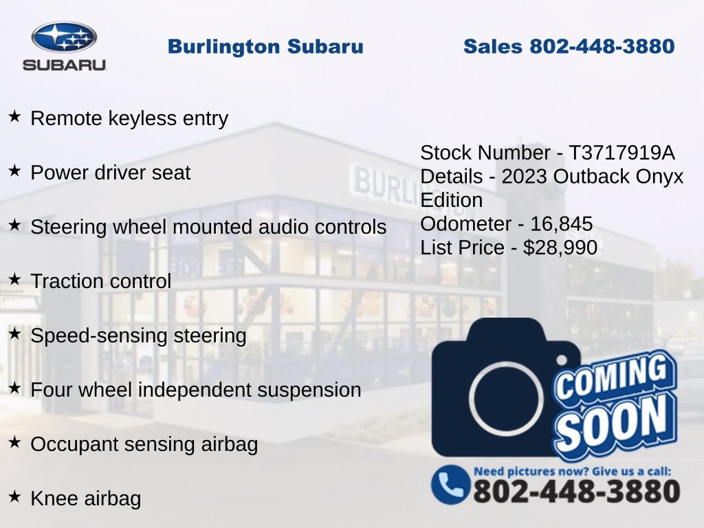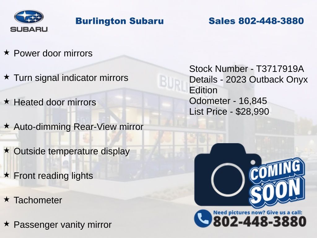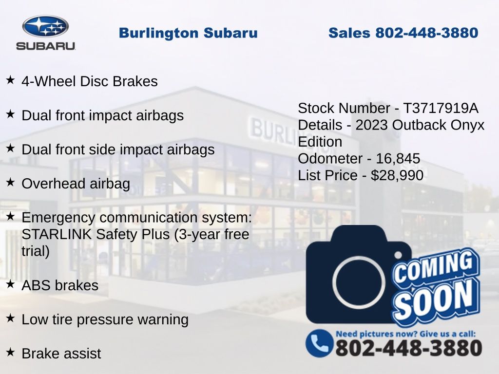 CARFAX One-Owner. Clean CARFAX. Subaru Outback Onyx Edition 2023 4-Wheel Disc Brakes, ABS brakes, Air Conditioning, Alloy wheels, AM/FM radio: SiriusXM, Auto High-beam Headlights, Auto-dimming Rear-View mirror, Automatic temperature control, Brake assist, Compass, Driver vanity mirror, Dual front impact airbags, Dual front side impact airbags, Electronic Stability Control, Emergency communication system: STARLINK Safety Plus (3-year free trial), Exterior Parking Camera Rear, Four wheel independent suspension, Front dual zone A/C, Front fog lights, Front reading lights, Fully automatic headlights, Garage door transmitter: HomeLink, Heated door mirrors, Heated Front Bucket Seats, Illuminated entry, Knee airbag, Leather Shift Knob, Leather steering wheel, Low tire pressure warning, Occupant sensing airbag, Outside temperature display, Overhead airbag, Panic alarm, Passenger vanity mirror, Power door mirrors, Power driver seat, Power steering, Power windows, Radio: Subaru STARLINK 11.6" Multimedia Plus Sys, Rear window defroster, Rear window wiper, Remote keyless entry, Speed control, Speed-sensing steering, Split folding rear seat, StarTex-Trimmed Upholstery, Steering wheel mounted audio controls, Steering Wheel Paddle Shift Control Switches, Tachometer, Telescoping steering wheel, Tilt steering wheel, Traction control, Trip computer, Turn signal indicator mirrors, Variably intermittent wipers. Odometer is 17026 miles below market average!