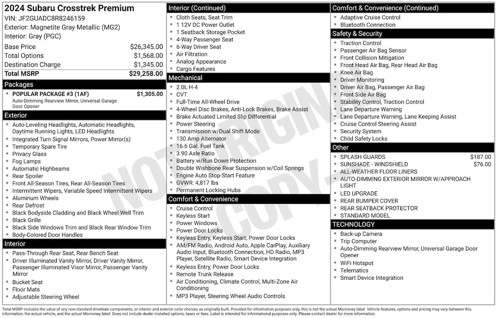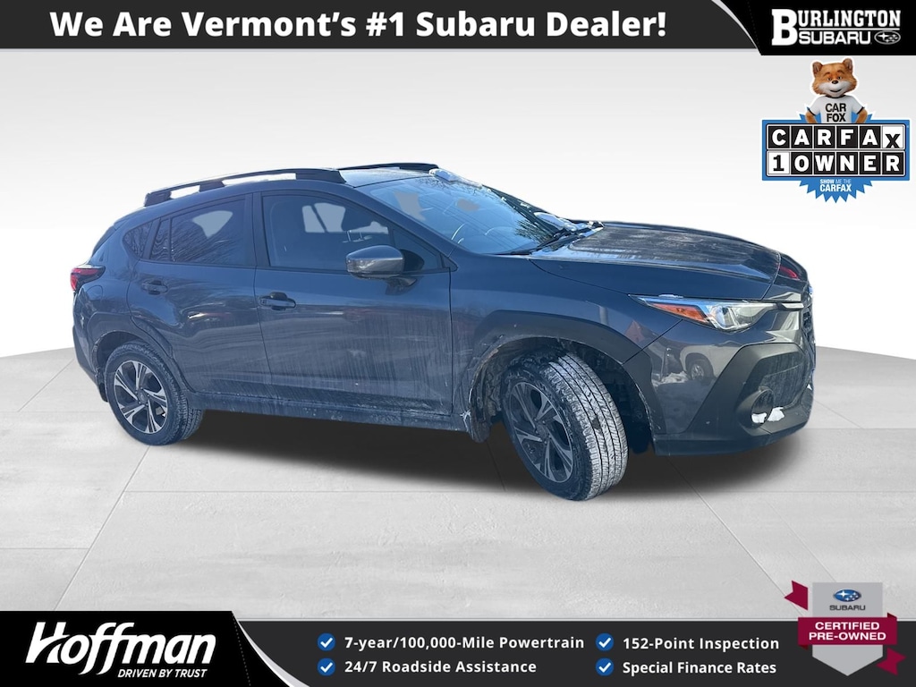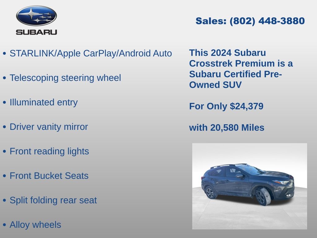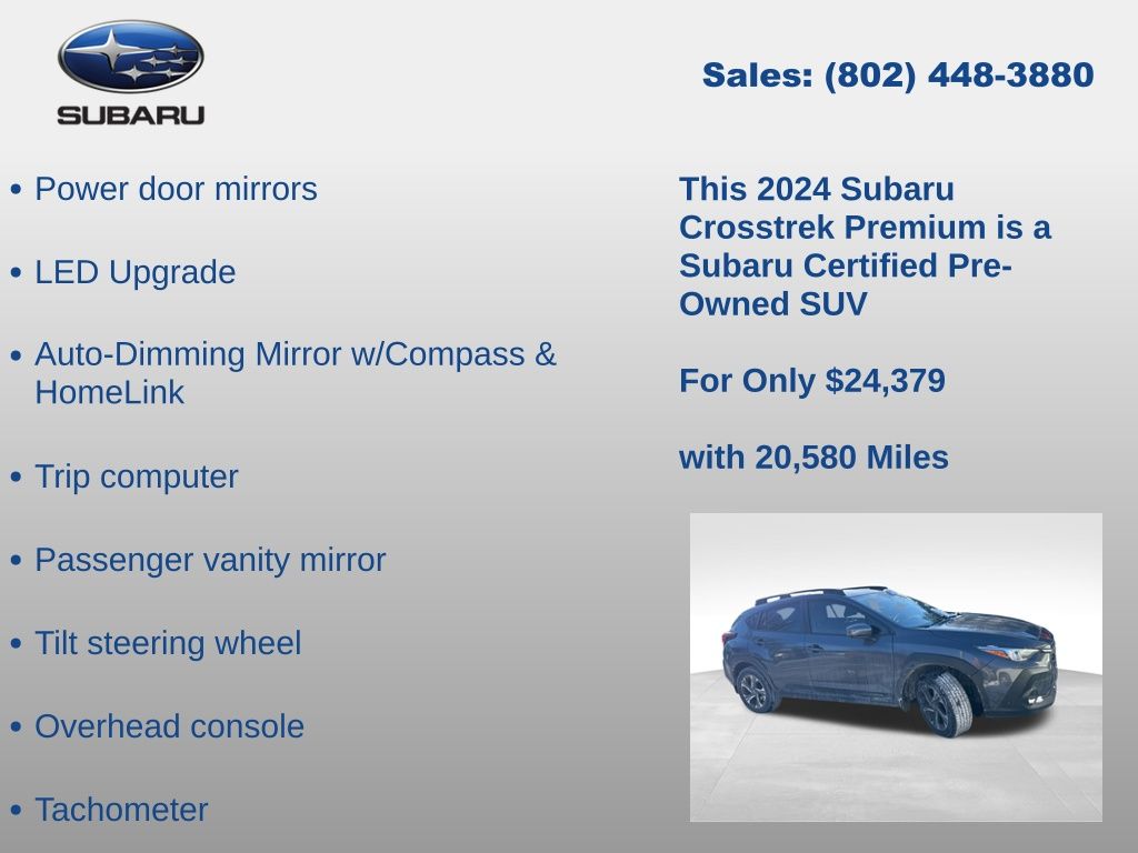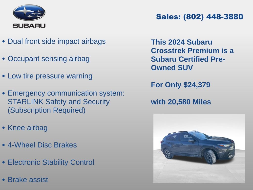 CARFAX One-Owner. Subaru Crosstrek Premium 2024 Certified. 4-Wheel Disc Brakes, ABS brakes, Air Conditioning, Alloy wheels, Anti-whiplash front head restraints, Auto High-beam Headlights, Auto-Dimming Exterior Mirror w/Approach Light, Auto-Dimming Mirror w/Compass & HomeLink, Automatic temperature control, Brake assist, Driver vanity mirror, Dual front impact airbags, Dual front side impact airbags, Electronic Stability Control, Emergency communication system: STARLINK Safety and Security (Subscription Required), Exterior Parking Camera Rear, Four wheel independent suspension, Front Bucket Seats, Front dual zone A/C, Front fog lights, Front reading lights, Fully automatic headlights, Illuminated entry, Knee airbag, LED Upgrade, Low tire pressure warning, Occupant sensing airbag, Overhead airbag, Overhead console, Panic alarm, Passenger vanity mirror, Power door mirrors, Power steering, Power windows, Radio: Subaru STARLINK 11.6" Multimedia Plus Sys, Rear window defroster, Rear window wiper, Remote keyless entry, Speed control, Speed-sensing steering, Split folding rear seat, STARLINK/Apple CarPlay/Android Auto, Steering wheel mounted audio controls, Tachometer, Telescoping steering wheel, Tilt steering wheel, Traction control, Trip computer, Turn signal indicator mirrors, Variably intermittent wipers. Odometer is 4689 miles below market average!
