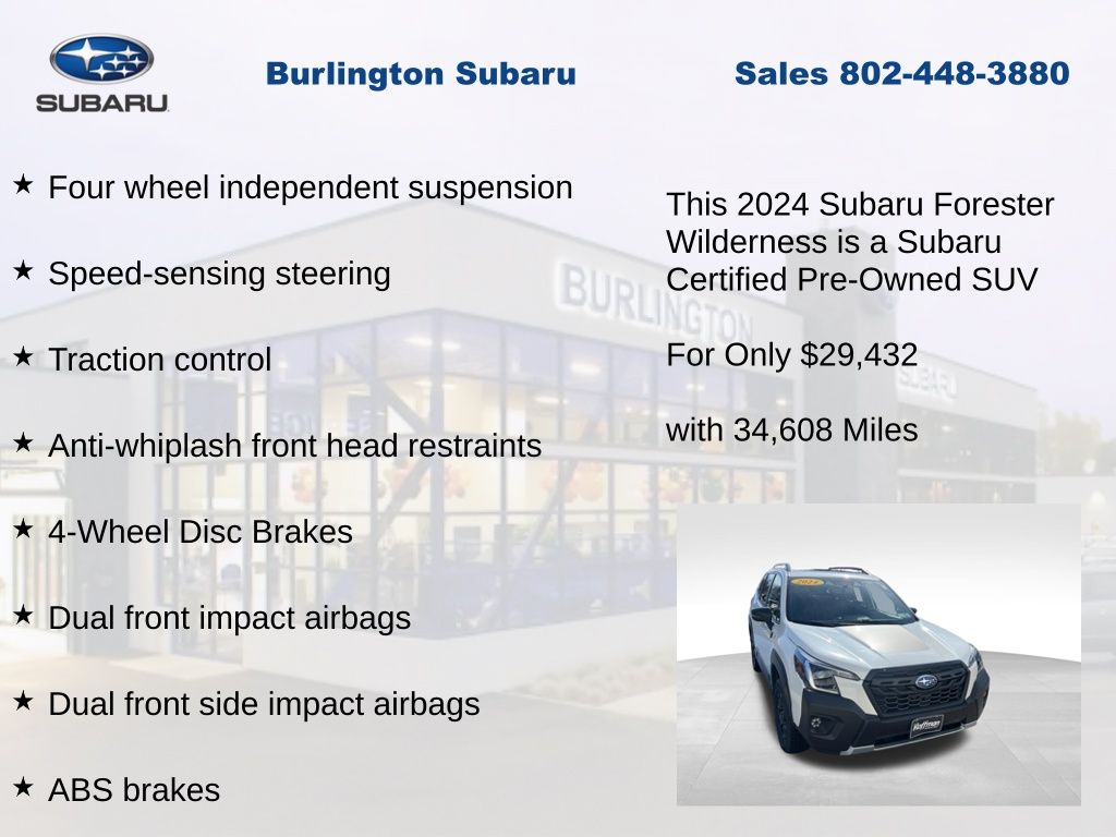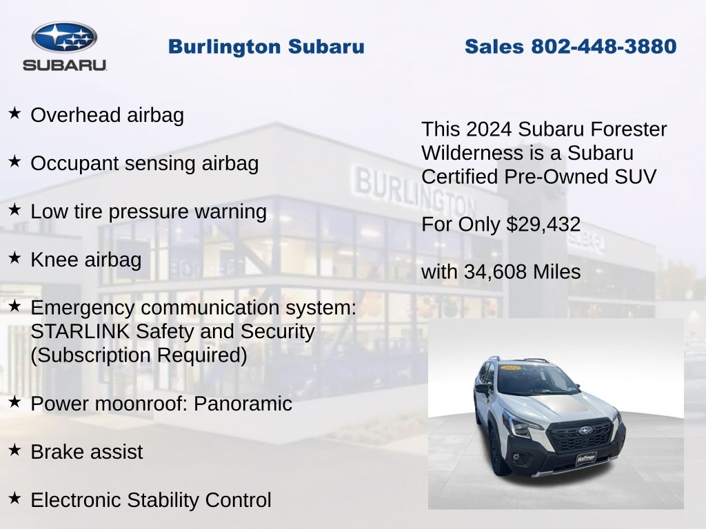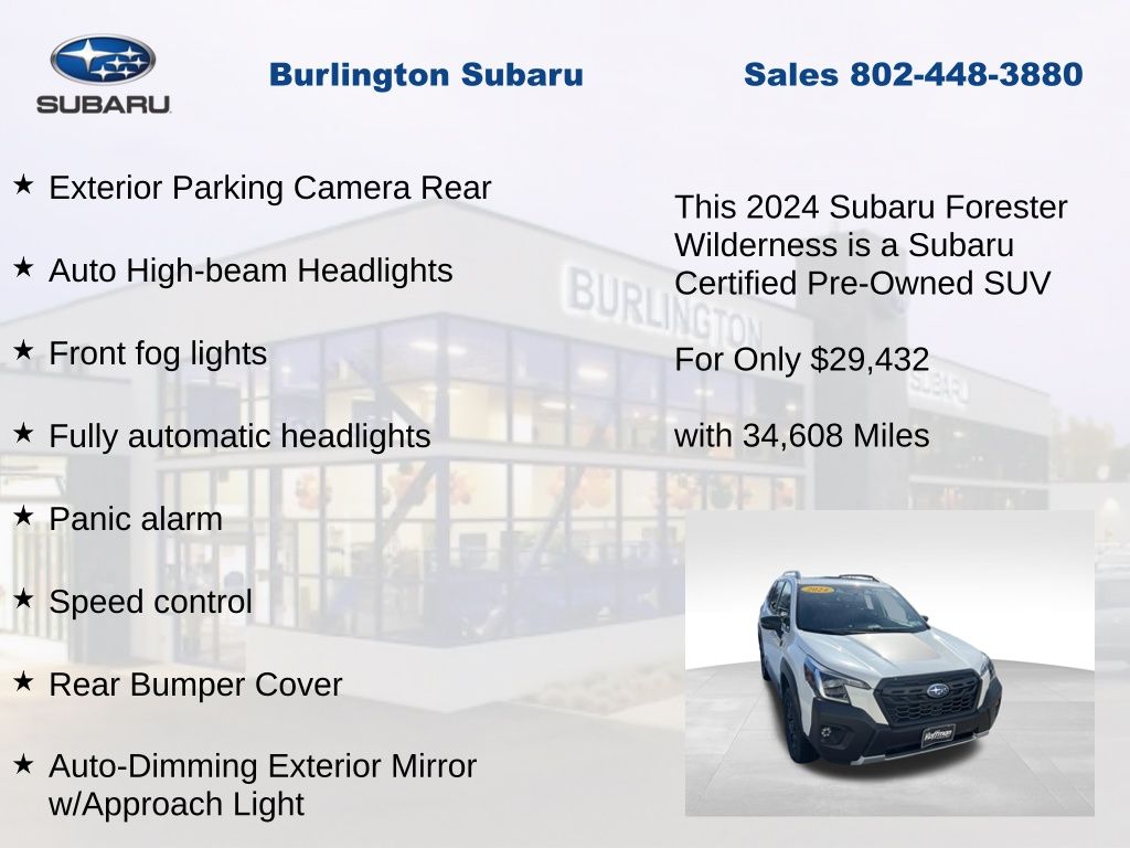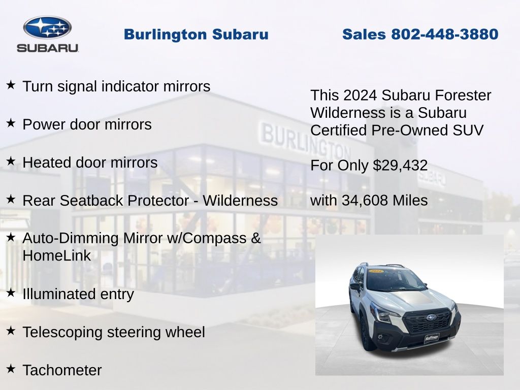 CARFAX One-Owner. Clean CARFAX. Subaru Forester Wilderness 2024 Certified. 4-Wheel Disc Brakes, ABS brakes, Air Conditioning, Alloy wheels, Anti-whiplash front head restraints, Auto High-beam Headlights, Auto-Dimming Exterior Mirror w/Approach Light, Auto-Dimming Mirror w/Compass & HomeLink, Automatic temperature control, Brake assist, Cargo Sidewall Protector, Driver vanity mirror, Dual front impact airbags, Dual front side impact airbags, Electronic Stability Control, Emergency communication system: STARLINK Safety and Security (Subscription Required), Exterior Parking Camera Rear, Four wheel independent suspension, Front dual zone A/C, Front fog lights, Front reading lights, Fully automatic headlights, Heated door mirrors, Heated Front Bucket Seats, Illuminated entry, Knee airbag, Leather Shift Knob, Leather steering wheel, Low tire pressure warning, Occupant sensing airbag, Outside temperature display, Overhead airbag, Panic alarm, Passenger vanity mirror, Power door mirrors, Power driver seat, Power moonroof: Panoramic, Power steering, Power windows, Radio: Subaru STARLINK 8.0" Multimedia Plus System, Rear Bumper Cover, Rear Seatback Protector - Wilderness, Rear window defroster, Rear window wiper, Remote keyless entry, Speed control, Speed-sensing steering, Split folding rear seat, STARLINK/Apple CarPlay/Android Auto, Steering wheel mounted audio controls, Tachometer, Telescoping steering wheel, Textured StarTex Upholstery, Tilt steering wheel, Traction control, Trip computer, Turn signal indicator mirrors, Variably intermittent wipers, Wilderness Package.