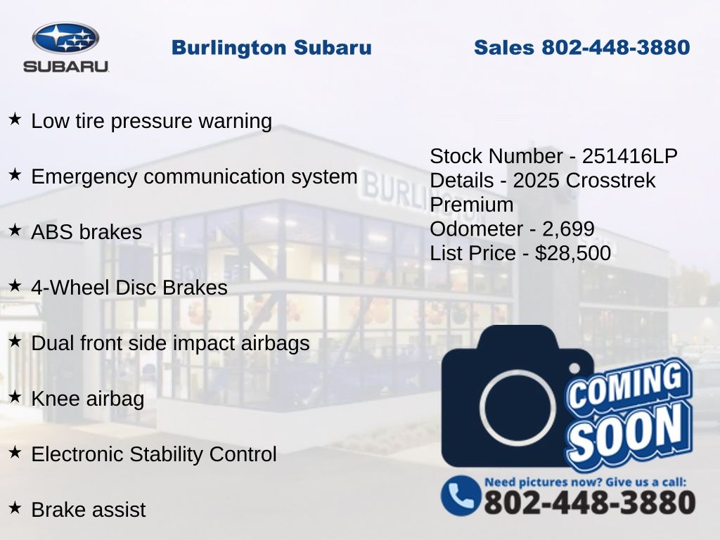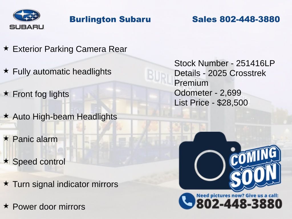Clean CARFAX. Subaru Crosstrek Premium 2025 4-Wheel Disc Brakes, ABS brakes, Air Conditioning, Alloy wheels, Anti-whiplash front head restraints, Auto High-beam Headlights, Automatic temperature control, Brake assist, Driver vanity mirror, Dual front impact airbags, Dual front side impact airbags, Electronic Stability Control, Emergency communication system, Exterior Parking Camera Rear, Four wheel independent suspension, Front Bucket Seats, Front dual zone A/C, Front fog lights, Front reading lights, Fully automatic headlights, Illuminated entry, Knee airbag, Low tire pressure warning, Occupant sensing airbag, Outside temperature display, Overhead airbag, Panic alarm, Passenger vanity mirror, Power door mirrors, Power steering, Power windows, Radio: Subaru 11.6" Multimedia Plus System, Rear window defroster, Rear window wiper, Remote keyless entry, Speed control, Speed-sensing steering, Split folding rear seat, Steering wheel mounted audio controls, Tachometer, Telescoping steering wheel, Tilt steering wheel, Traction control, Trip computer, Turn signal indicator mirrors, Variably intermittent wipers. Odometer is 2465 miles below market average!