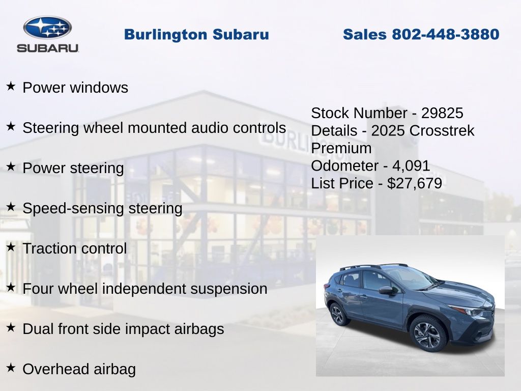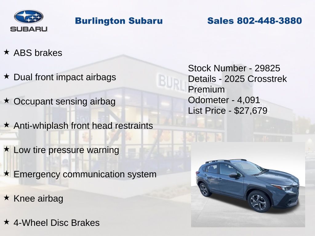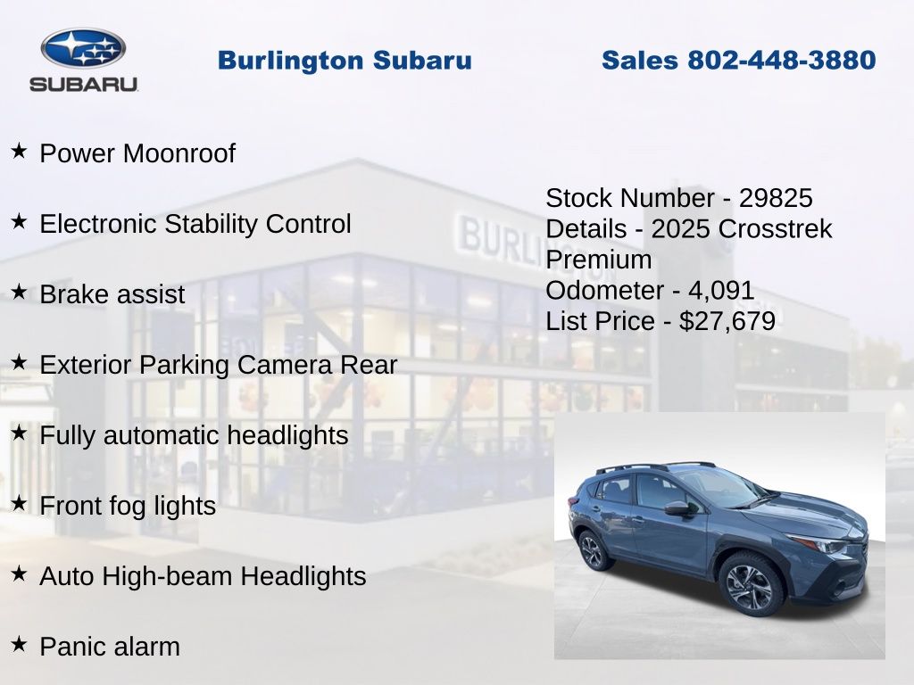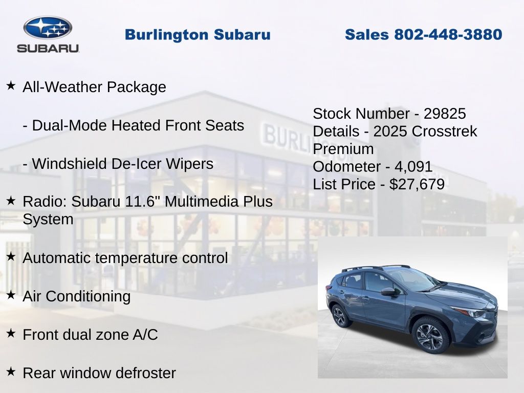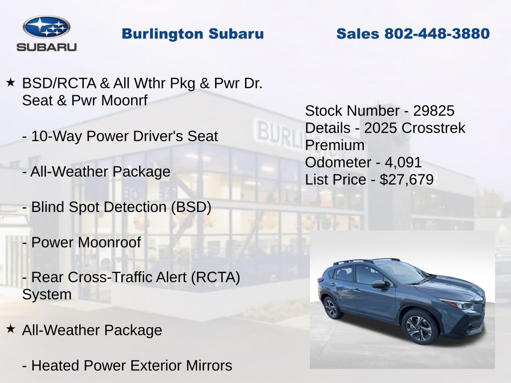 CARFAX One-Owner. Clean CARFAX. Subaru Crosstrek Premium 2025 10-Way Power Driver's Seat, 4-Wheel Disc Brakes, ABS brakes, Air Conditioning, All-Weather Package, Alloy wheels, Anti-whiplash front head restraints, Auto High-beam Headlights, Automatic temperature control, Blind Spot Detection (BSD), Brake assist, BSD/RCTA & All Wthr Pkg & Pwr Dr. Seat & Pwr Moonrf, Driver vanity mirror, Dual front impact airbags, Dual front side impact airbags, Dual-Mode Heated Front Seats, Electronic Stability Control, Emergency communication system, Exterior Parking Camera Rear, Four wheel independent suspension, Front dual zone A/C, Front fog lights, Front reading lights, Fully automatic headlights, Heated Power Exterior Mirrors, Illuminated entry, Knee airbag, Low tire pressure warning, Occupant sensing airbag, Outside temperature display, Overhead airbag, Panic alarm, Passenger vanity mirror, Power door mirrors, Power Moonroof, Power steering, Power windows, Radio: Subaru 11.6" Multimedia Plus System, Rear Cross-Traffic Alert (RCTA) System, Rear window defroster, Rear window wiper, Remote keyless entry, Speed control, Speed-sensing steering, Split folding rear seat, Steering wheel mounted audio controls, Tachometer, Telescoping steering wheel, Tilt steering wheel, Traction control, Trip computer, Turn signal indicator mirrors, Variably intermittent wipers, Windshield De-Icer Wipers.